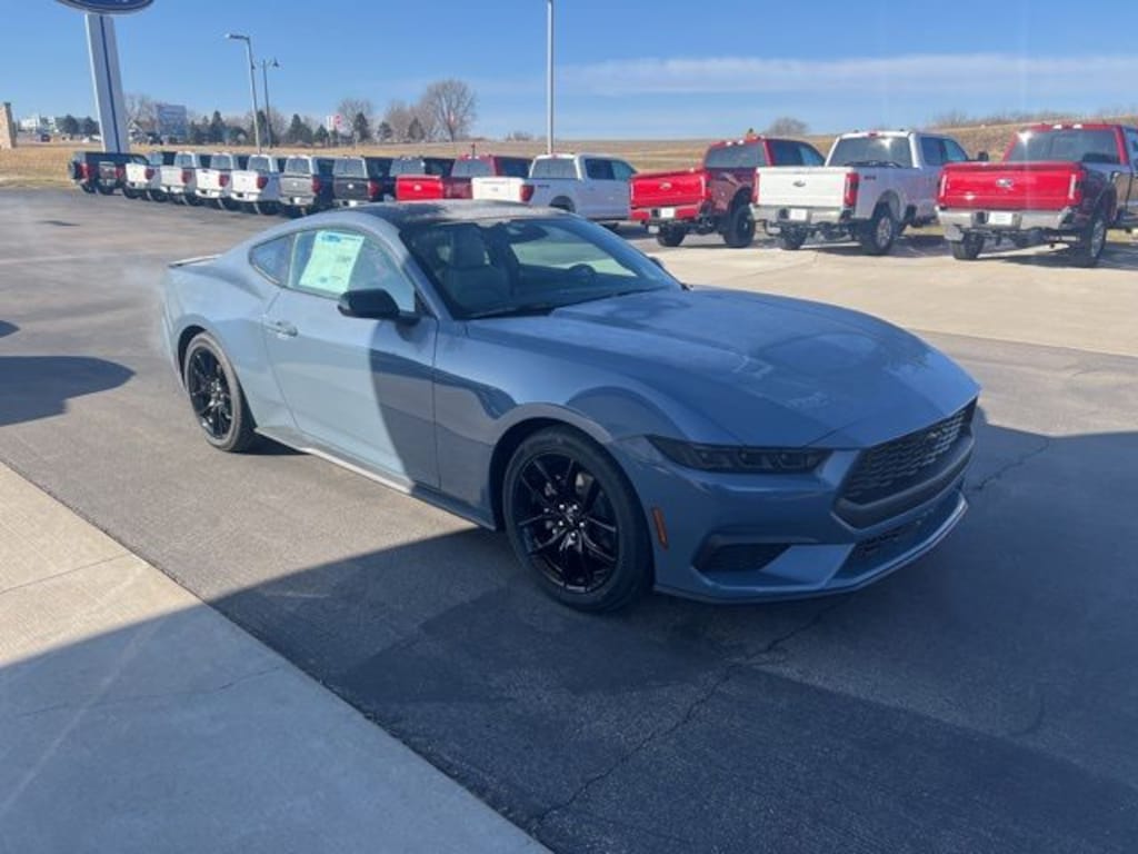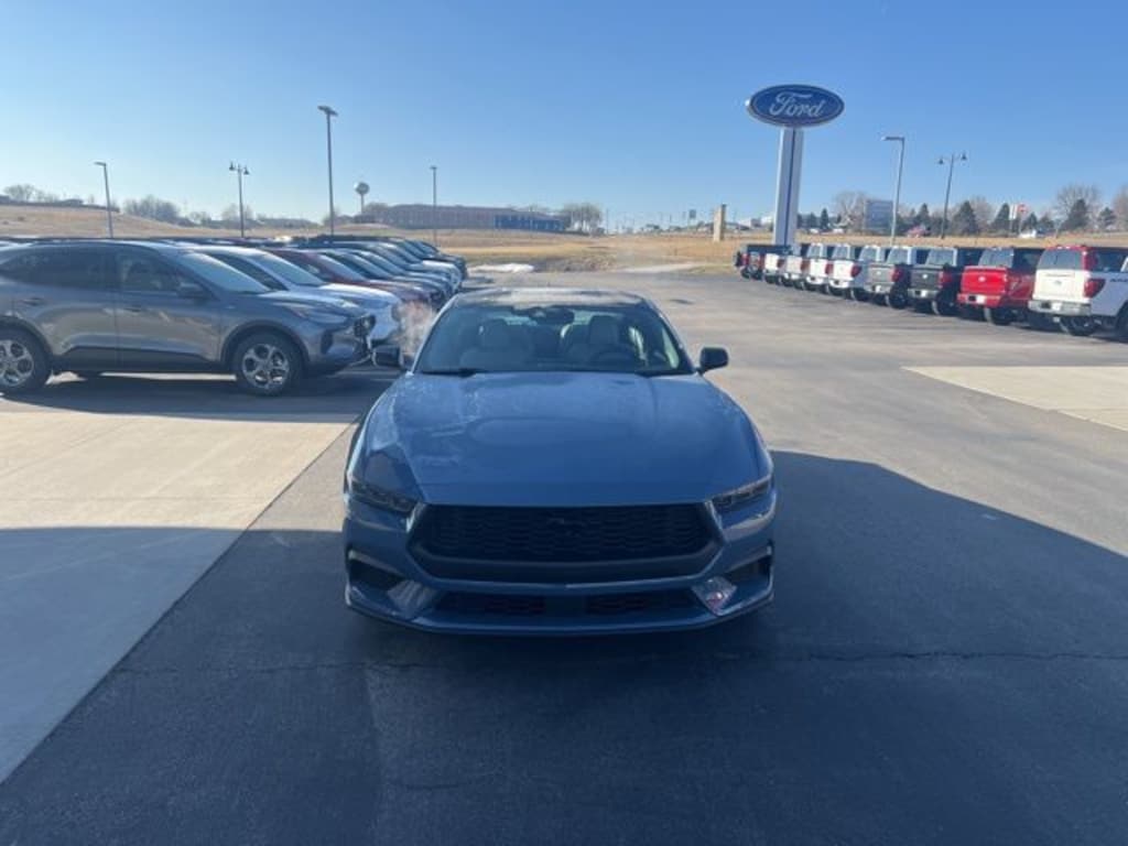 New Price! Vapor Blue 2026 Ford Mustang RWD 10-Speed Automatic EcoBoost 2.3L I4 GTDi DOHC Turbocharged VCT 9-Speaker Stereo System, Active Valve Performance Exhaust, AM/FM Stereo, Black Front and Rear Pony Badges, Black Mirror Caps, Black Painted Wedge Decklid Spoiler, Cloth/Vinyl Heated Bucket Seats, Equipment Group 101A High Package, Mustang Nite Pony Package, Painted Black Roof, SiriusXM with 360L and HD Radio, SYNC 4, Wheels: 19" x 8.5" Ebony Black-Painted Aluminum.