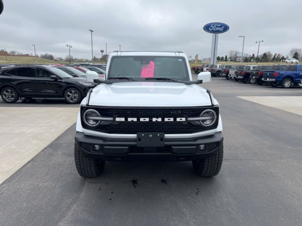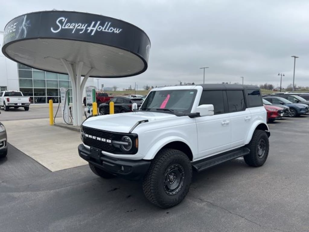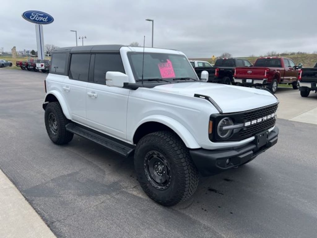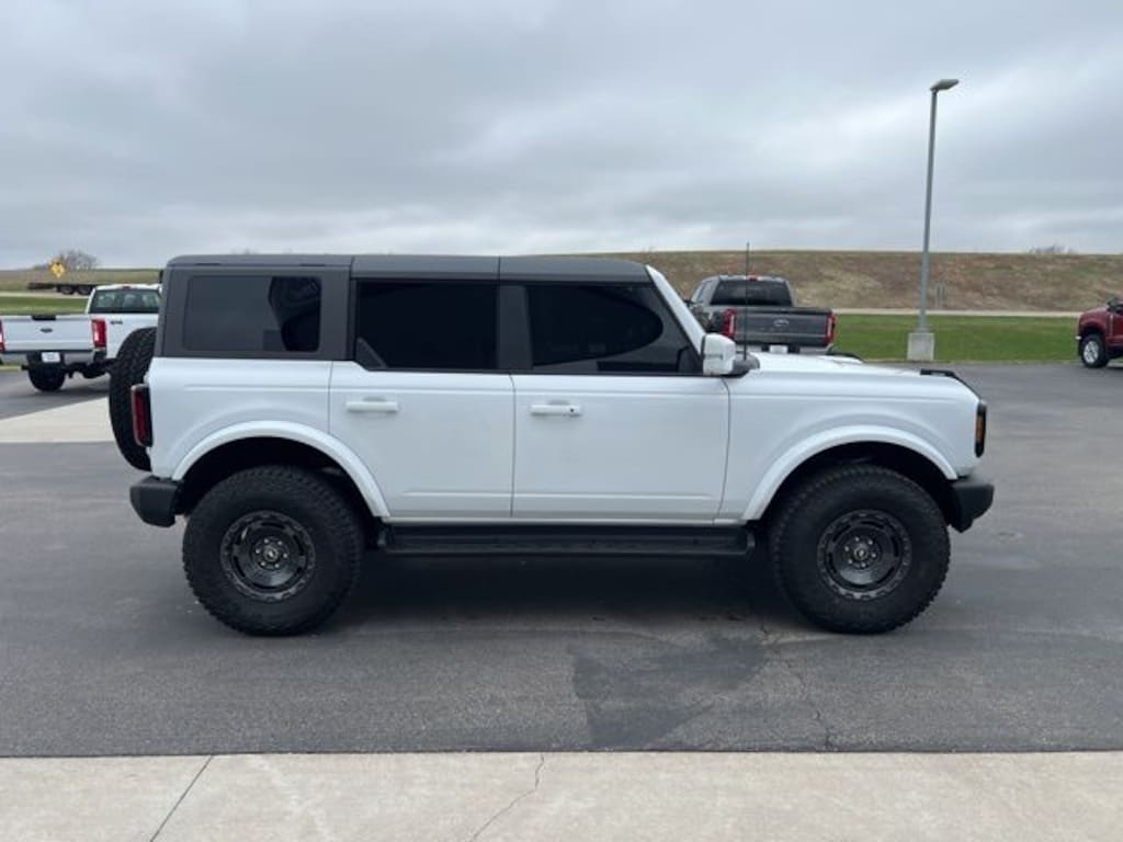 Oxford White 2025 Ford Bronco Outer Banks 4WD 10-Speed Automatic 2.7L EcoBoost V6 LOCAL TRADE, ONE OWNER, 18" Bright Machined Aluminum Wheels, 360-Degree Camera, 4.7 Final Drive Ratio, Adaptive Cruise Control, Equipment Group 314A Lux Package, Evasive Steering Assist, Front Parking Sensors, Heated front seats, Heated Leather-Trimmed/Vinyl Bucket Seats, Heated steering wheel, High Clearance Fender Flares, High Clearance Suspension, Information on Demand Panel, Navigation system: Connected Navigation, Position-Sensitive Bilstein Shock Absorbers, Radio: B&O Sound System by Bang & Olufsen, Rear-Window Defroster & Washer, Sasquatch Package, Sideview Mirrors, Trailer Tow Package (DIO), Universal Garage Door Opener, Wheels: 17" Carbonized Gray Painted Aluminum.